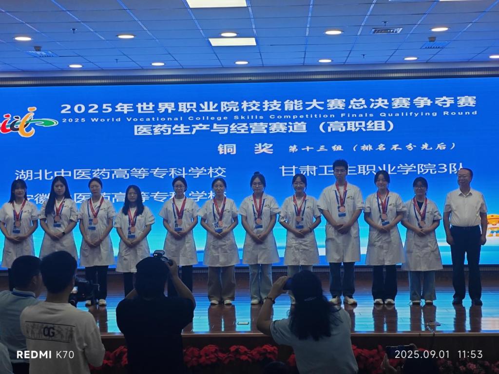 2025年8月27日至9月1日,世界职业院校技能大赛总决赛争夺赛医药生产与经营赛道在山西药科职业学院隆重举行。湖北中医药高等专科学校参赛队由学生杨尧、廖凯莉、廖雅文、李嘉茵和领队张昌文、指导老师刘一文、张超组成。在全国154支参赛强队中,脱颖而出,以中药调剂、鉴定、炮制及丸剂制备等环节的规范操作,我校选手凭借在中药调剂、鉴定、炮制及丸剂制备等环节的规范操作脱颖而出,最终斩获医药生产与经营赛道铜奖。
