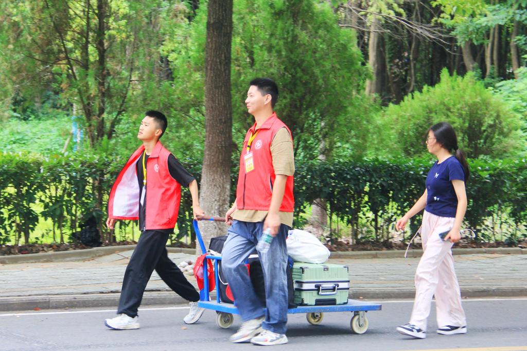 为减轻新生奔波之劳,校园内设置快速通道,还有一对一志愿者贴心协助搬运。从校门到主干道,从报到区到生活区,随处可见“红马甲”忙碌的身影,微笑与热情成为这个秋天医专最美的风景。