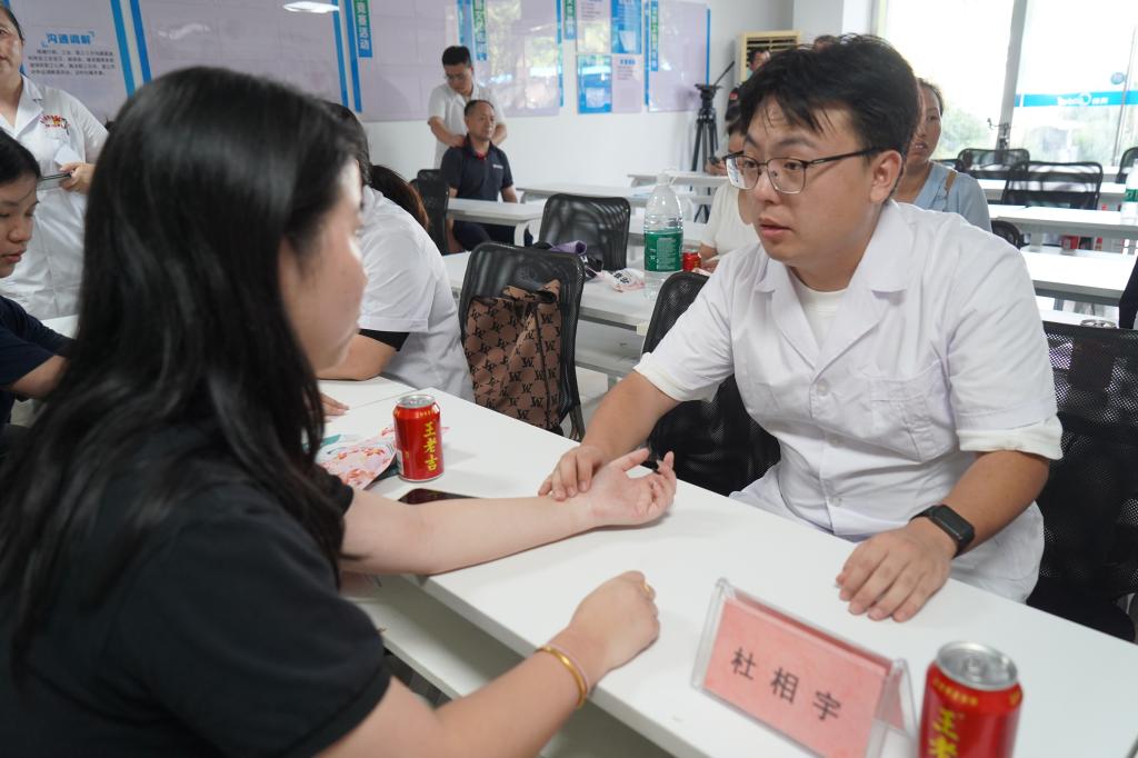 义诊区很快排起长队,美的电冰箱车间的常琼芳大姐前来咨询:“医生,我这腿一吹空调就抽筋,晚上疼得睡不着!”该校三板桥医院医生李开望对其进行体质辨识和认真体检后取来艾条,在足三里穴位上方进行艾灸,随着艾烟袅袅升起,常大姐感到了燃烧艾绒的热力和药性刺激,15分钟后,她惊喜地发现下肢冰凉疼痛的感觉明显减轻。