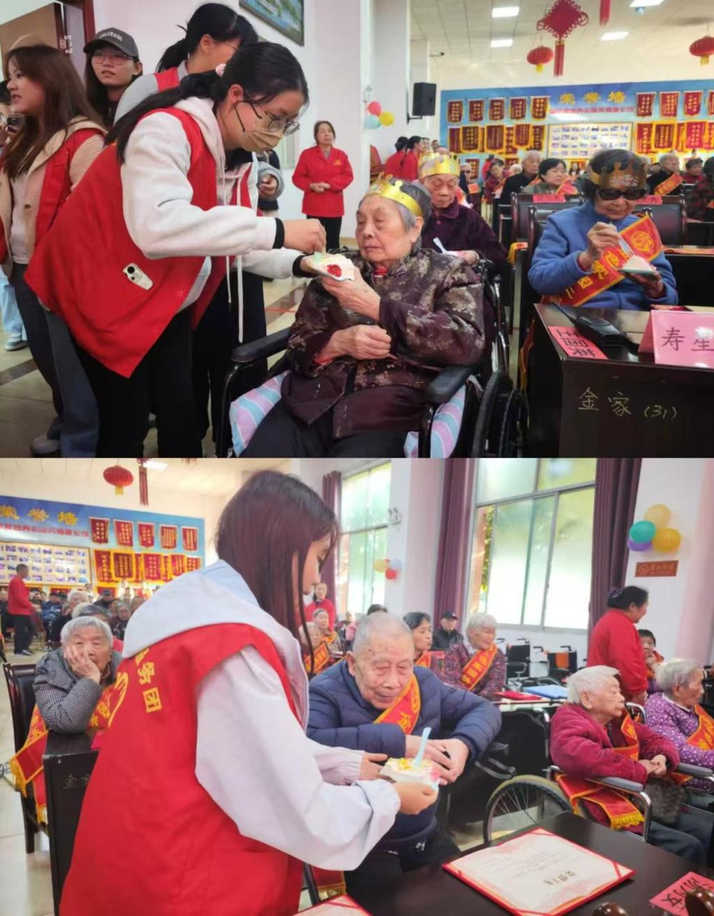 为高龄老人集体过生日环节,志愿者们端上精心准备的节日蛋糕,逐一送到在座的每一位老人手中。分发过程中,同学们不仅细心周到,更俯身与老人们亲切交谈,关心他们的身体状况与日常生活。